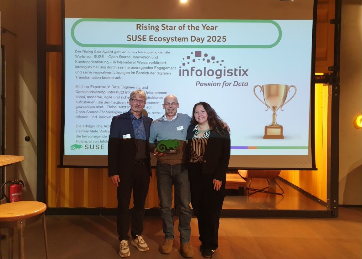 Der Rising Star Award geht an einen Partner, der die Werte von SUSE – Open Source, Innovation und Kundenorientierung – in besonderer Weise verkörpert. Infologistix hat uns durch sein herausragendes Engagement und seine innovativen Lösungen im Bereich der digitalen Transformation beeindruckt. Mit ihrer Expertise in Data Engineering und Containerisierung unterstützt Infologistix Unternehmen dabei, moderne, agile und sichere IT-Infrastrukturen aufzubauen, die den heutigen Herausforderungen gewachsen sind. Dabei setzt Infologistix auf Open-Source-Technologien und trägt so zu einem offenen und innovativen Ökosystem bei.