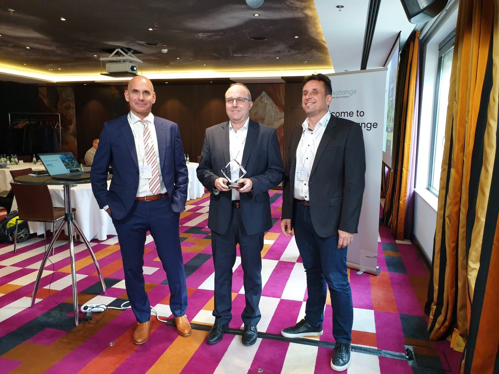 Preisverleihung an die SICK AG auf der SUSE Exchange München: Ivo Totev, SUSE – Dr. Stefan Odermatt, SICK AG – Holger Pfister, SUSE (von rechts nach links)