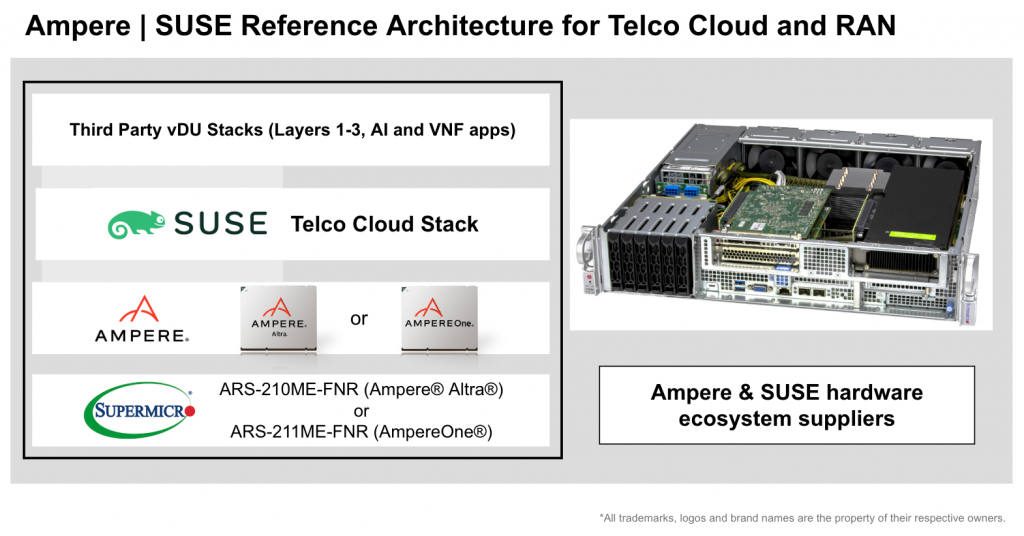 The Ampere and SUSE joint solution for telco clouds delivers a future-proof, open, cloud-native telco platform that combines unmatched core density, best-in-class power efficiency, and carrier-grade real-time performance, all without the need of additional accelerators or vendor lock-in.