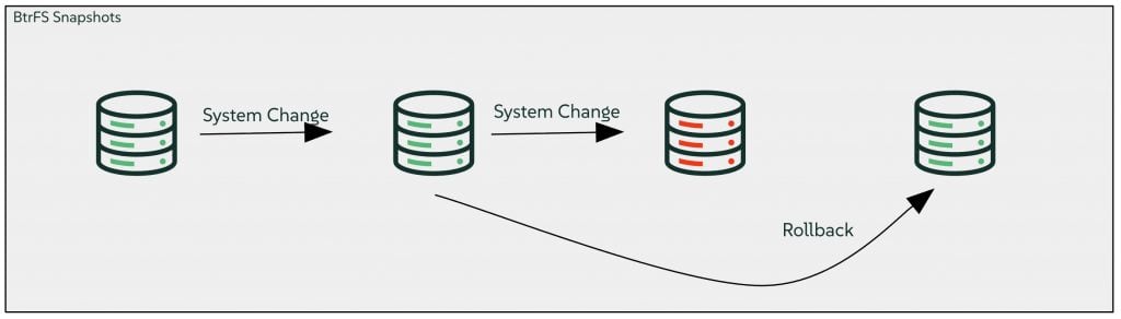 Btrfs (usually pronounced as “Butter FS”) is a Copy-on-Write (CoW) file system for Linux. When data is modified, Btrfs doesn’t overwrite the old data. Instead, it writes the new data to an available block and updates the pointers to the data. Because of CoW architecture and supporting software, you can take a “snapshot” of your entire system nearly instantaneously. It takes up almost no space initially because it just points to the existing data. It’s only as the system is used over time that the snapshot begins to consume space by retaining the old snapshot data.