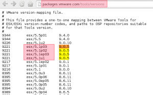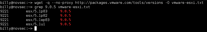 $ wget -q http://packages.vmware.com/tools/versions -0 vmware-esxi.txt $ grep 9.0.5 vmware-esxi.txt