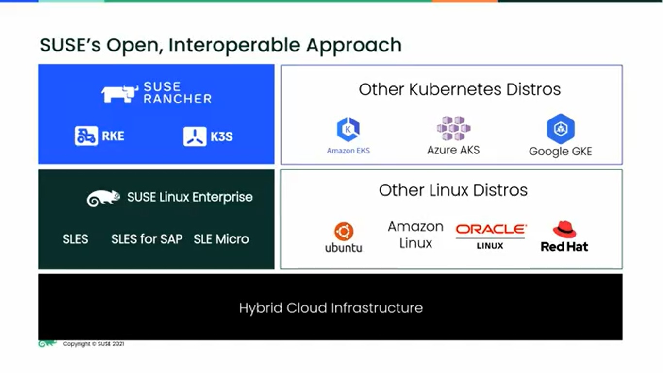 Mindennek a központjában a SUSE Rancher áll, amely lehetőséget biztosít a konténerek, illetve a Kubernetes clusterek egységes kezelésére, megkönnyítve a fejlesztők és az üzemeltetők feladatait. A megoldás segítségével bármilyen környezetben egyszerűen üzembe helyezhetők és felügyelhetők a konténerizált szolgáltatások, beleértve az adatközpontokat, a peremhálózatokat és a felhőt. Ezáltal nincs szükség extra tudásra a konténerek használatához, tehát mind az üzemeltetők, mind a fejlesztők a saját munkájukra koncentrálhatnak.