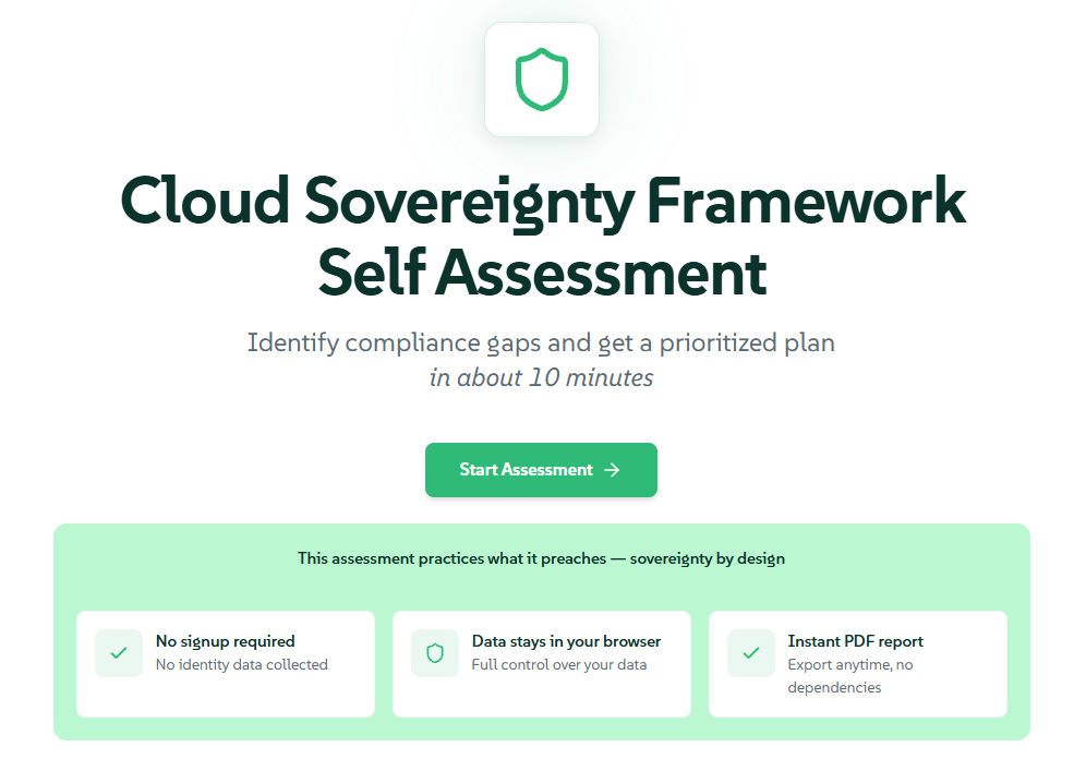 Cloud Sovereignty Framework Self Assessment to pierwsze tego rodzaju narzędzie, które oferuje automatyczną ocenę zgodności z wymogami nowych ram unijnych dla suwerenności chmury obliczeniowej z 2025 r. Stawia na pierwszym miejscu prywatność użytkowników i dostarcza analizę luk w mniej niż 20 minut.
