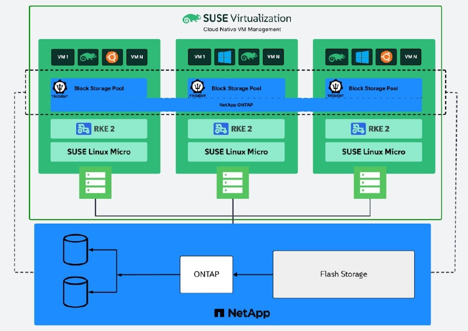 The “secret sauce” in this integration is NetApp Trident, an open-source storage orchestrator that serves as a Container Storage Interface (CSI). Trident allows SUSE Virtualization to dynamically provision and manage storage resources directly on NetApp ONTAP systems.