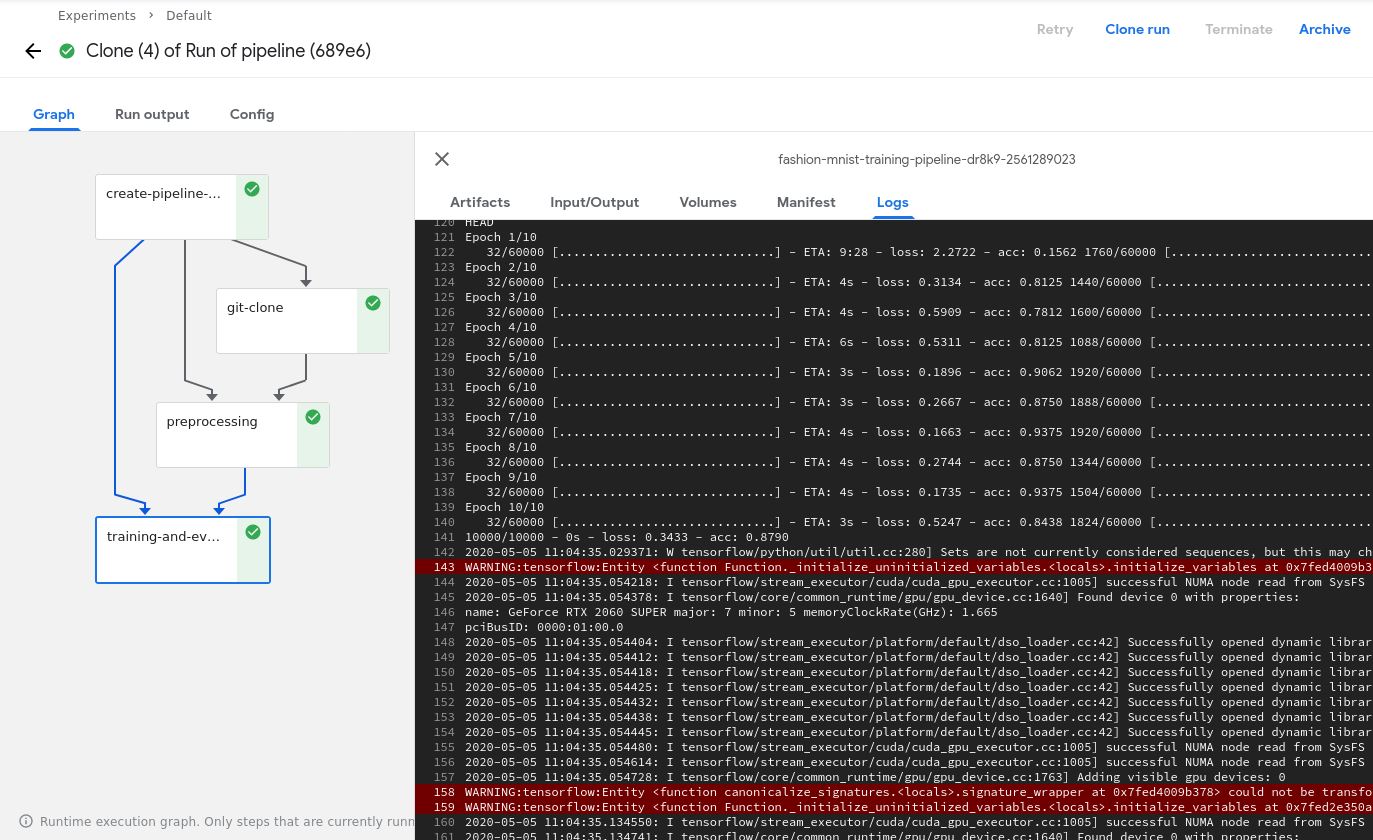 In this article, we went through the process of preparing a machine learning project for Kubeflow, followed by constructing a Kubeflow machine learning pipeline and finally using the Kubeflow interface to upload and execute a pipeline. The wonderful thing about this approach is that your machine learning project can be as simple or complex as you want and you would still be able to use the same techniques shown here.