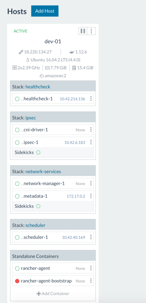 So, what’s going on here? The rancher-agent-bootstrap container runs once to get the rancher-agent up and running then stops (notice the red circle indicating a stopped container). As we can see above, the health check container is starting up. Once all infrastructure containers are up and running on the host you’ll see this: