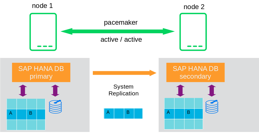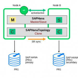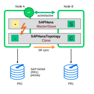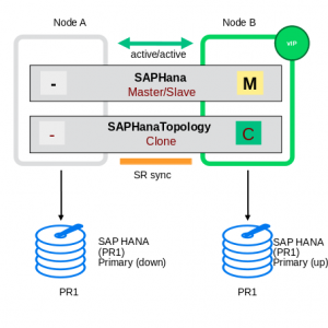 | The first picture shows a SAP HANA “PR1” in system replication setup. The left node has the primary SAP HANA instance which means that this one is the instance clients should access for read/write actions. | ![]() |