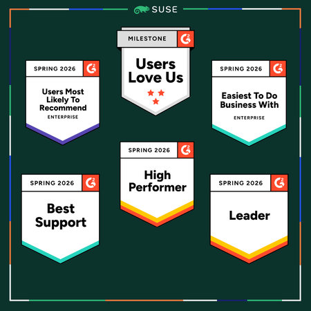 I’m delighted to share that G2, the world’s largest and most trusted tech marketplace, has recognized SUSE’s solutions once again. We received 64 badges in its 2026 Spring Report across our portfolio for SUSE Rancher Prime, SUSE Linux Enterprise Server (SLES), SUSE Multi-Linux Manager (formerly SUSE Manager) and SUSE Cloud Observability. We received 10 badges in the Server Virtualization category, 10 in the Cloud Infrastructure Automation category, 11 in the Container Management category, 18 in the DevOps category and 2 in the IOT Edge Platforms category. We also received the overarching “Users Love Us” badge!