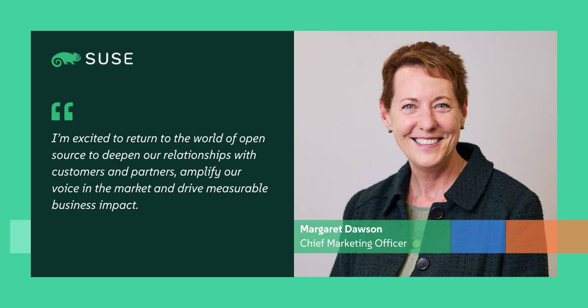SUSE®, a global leader in innovative, open and secure enterprise-grade solutions, today announced the appointment of Margaret Dawson as chief marketing officer. In this role, Dawson will drive SUSE’s global marketing strategy and expand SUSE’s global presence to continue its trajectory of growth, innovation and open source leadership.
